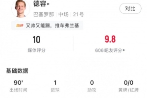 本场比赛荷兰中场弗兰基•德容为巴萨首发踢满全场,全场比赛他不仅完成破门,还成为球队的节拍器,传球多达116脚的同时,传球成功率高达97%。最终他获得了10分的满分评分,同时当选全场最高评分。