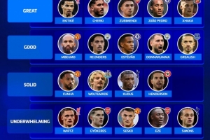 优秀——埃基蒂克(利物浦)、谢尔基(曼城)、苏维门迪(阿森纳)、若昂·佩德罗(切尔西)、扎卡(桑德兰)