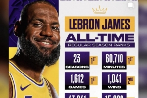 长河~詹姆斯常规赛出战赛季&时间&场次&得分&命中数 皆为历史第一