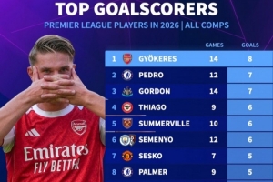 英超球员2026年各项赛事进球排名:约克雷斯14场8球独自领跑