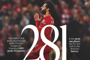 萨拉赫英超送出92记助攻,与杰拉德并列队史最多