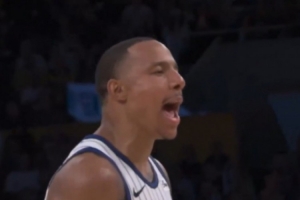 GIF——贝恩在詹姆斯头上投进关键三分 大喊“颜射你,勒布朗。(ON YOUR HEAD BRON)”