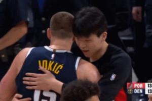 GIF-约基奇看到了杨瀚森 过去两个人爱的抱抱