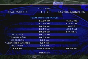 体育资讯4月8日讯 在欧冠淘汰赛首回合,拜仁2-1击败皇马。以下为双方球员本场比赛跑动数据前列的球员。