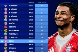 奥利塞本赛季德甲22轮已18次助攻,距离联赛历史纪录还差4次