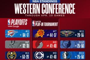 西部第3与第4将在湖人与掘金之间决出;西部第8与第9将在开拓者与快船之间决出;